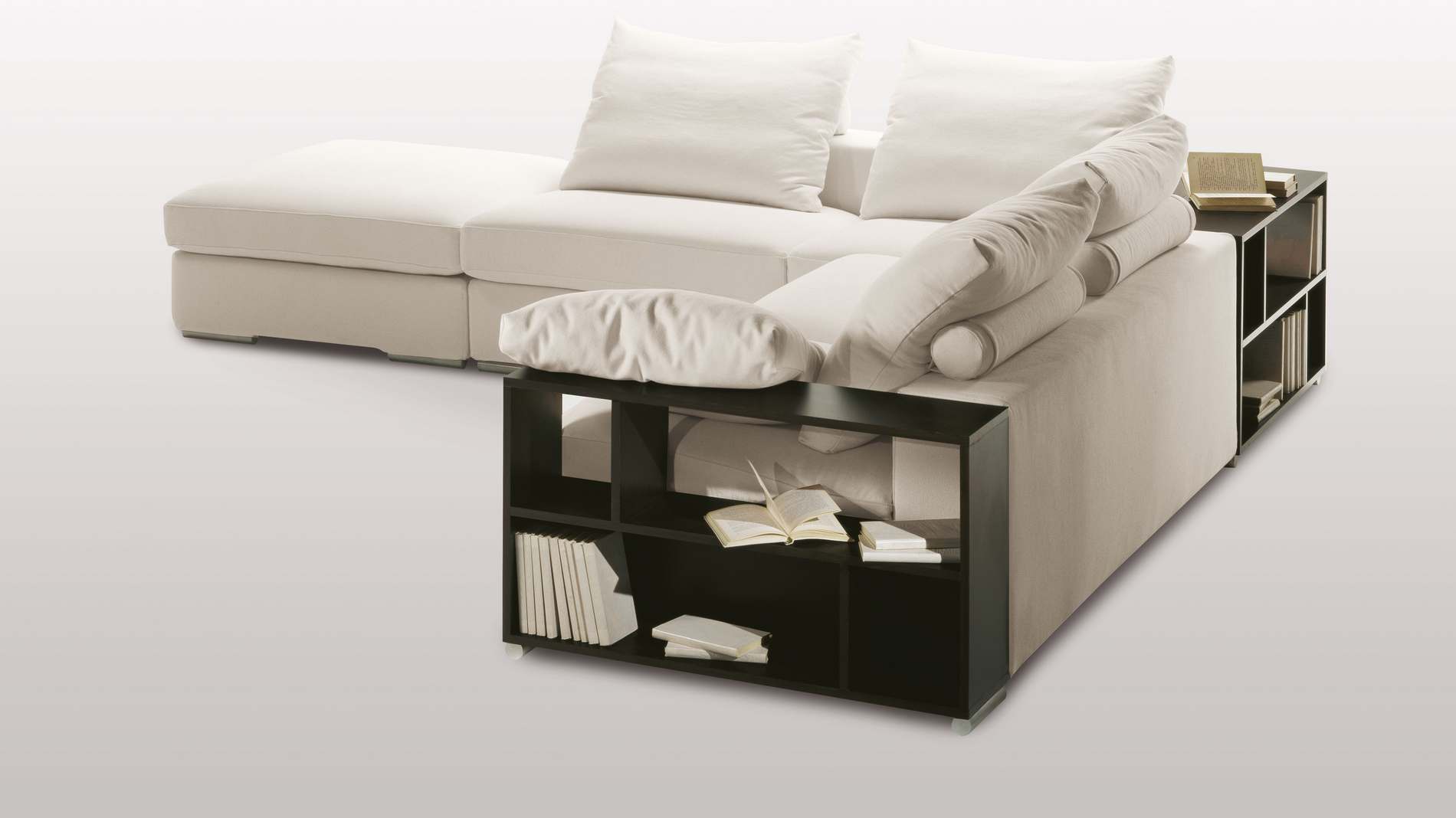 Il divano è infatti accompagnato da una libreria, sul fianco o sulla parte posteriore in continuità con lo schienale, che lo rende un complemento d’arredo decisamente poliedrico.
