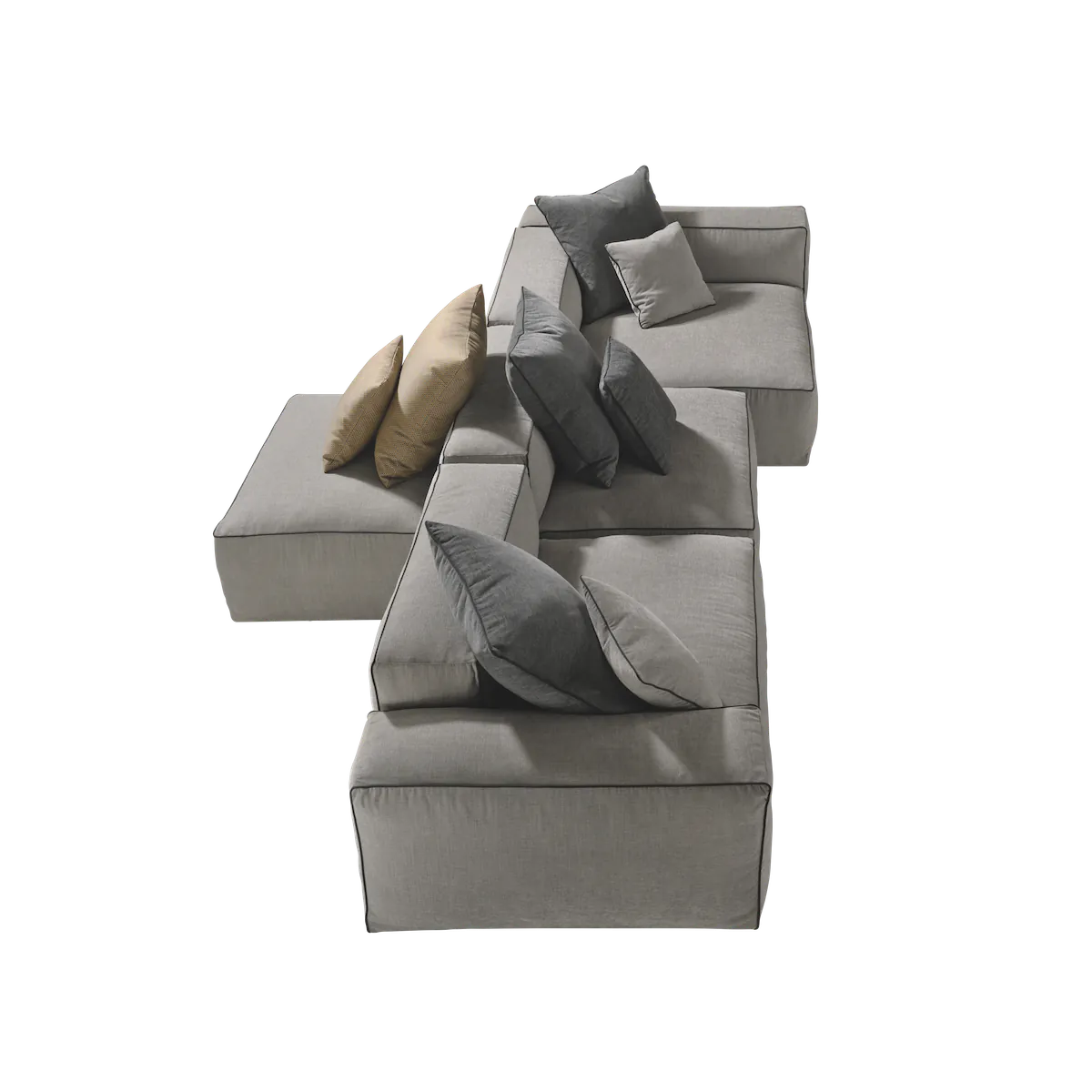 Questo divano è moderno e di colore grigio, con un design elegante. Ha quattro cuscini disposti in fila, posizionati simmetricamente ai lati del divano. Questa disposizione crea un’atmosfera invitante e piacevole. Nel complesso, il design del divano e dei cuscini suggerisce uno spazio abitativo contemporaneo e di stile.