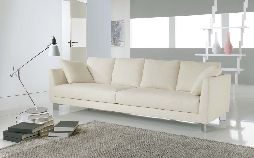 “Divano moderno dalla linea rialzata e realizzato in tessuto.