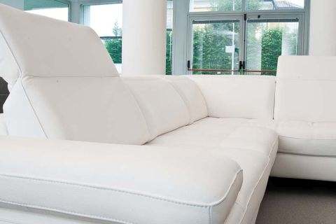 Divano angolare foderato in pelle, caratterizzato dall’estrema eleganza di un look total white.