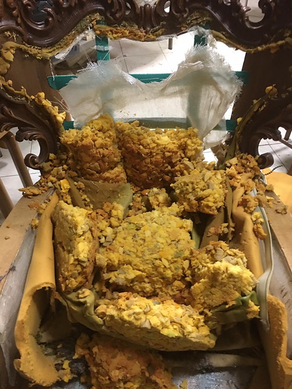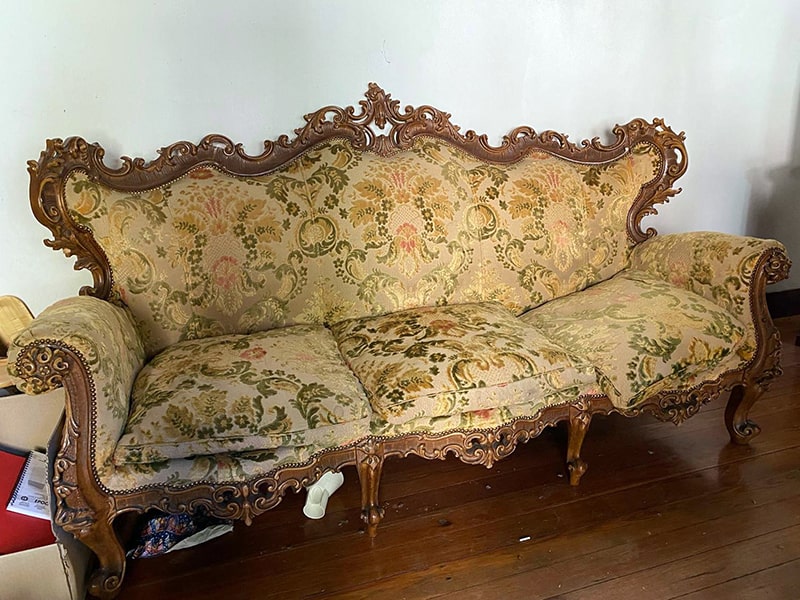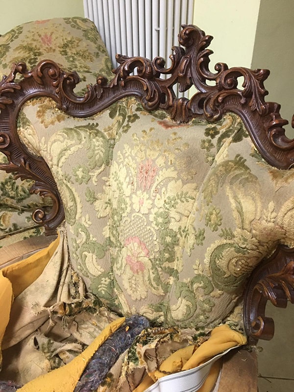 Nella nostra bottega artigiana è arrivato un divano con poltrone in stile che aveva bisogno di un urgente rifacimento totale, strutturale ed estetico.